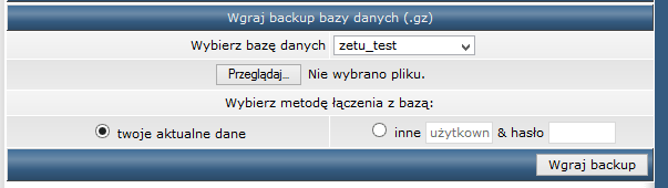 Klikamy „Przeglądaj…” i z komputera wybieramy folder .gz z bazą, którą wcześniej zapisywaliśmy na komputerze. I klikamy przycisk „Wgraj backup”. I na tym kończy się kopiowanie bazy danych.