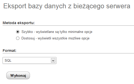 Logujemy się do phpMyAdmin wpisując nazwę bazy i hasło. Po zalogowaniu wchodzimy w zakładkę „Export”. Wybieramy format zapisu do SQL i klikamy „Wykonaj”.