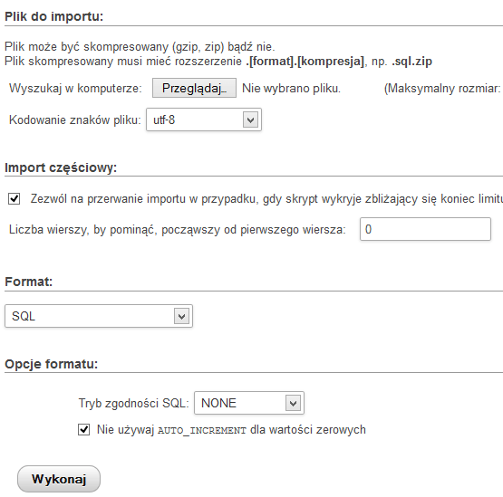 Klikamy na przycisk „Przeglądaj…”, na komputerze wybieramy utworzony plik .zip i klikamy „Wykonaj”.