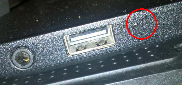 Aby wejść w bios w tym modelu trzeba się trochę wysilić. Najpierw wyłączamy komputer, następnie bierzemy jakiś cienki długopis lub wykałaczkę i musimy odnaleźć z prawej strony przy wejściu USB dziurkę z ikonką przypominającą słuchawki. Coś takiego jak na obrazku.