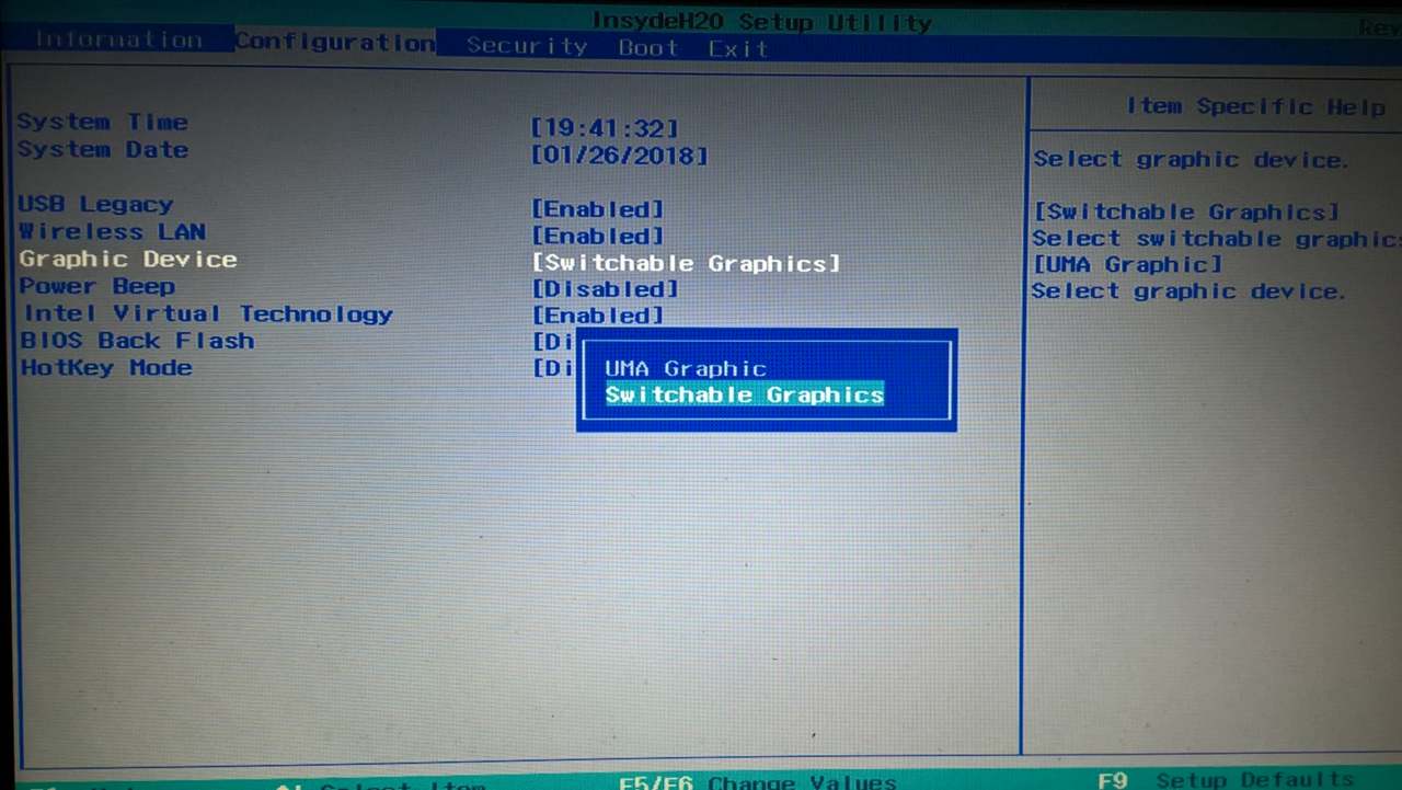 Zjeżdżamy do opcji Graphic Device, klikamy Enter i wybieramy opcję Switchable Graphics i również zatwierdzamy Enterem. Teraz wystarczy zapisać (jak dobrze pamiętam) klawiszem F10 (jak podpowiada dolne menu), czyli Save and exit.
