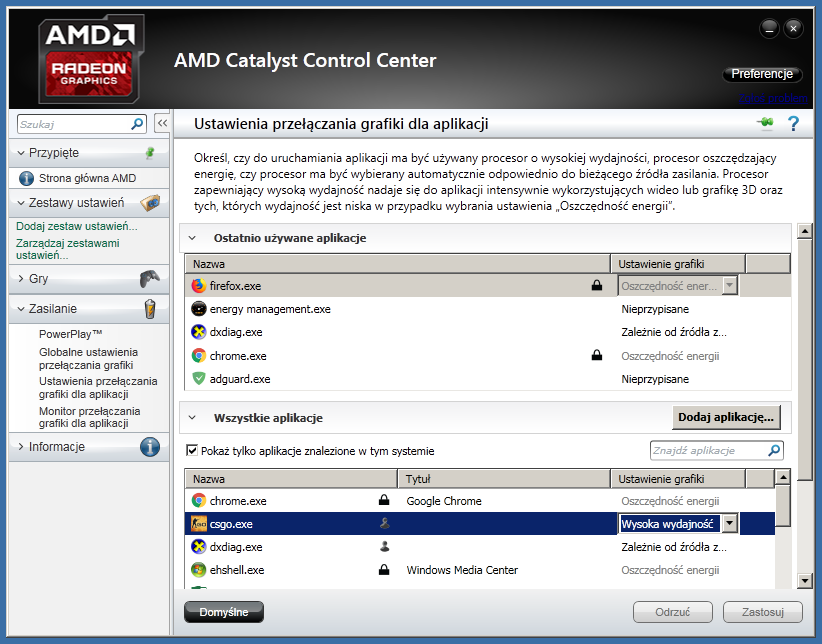 W tym modelu B50-80 dedykowana karta graficzna uruchamia się w momencie kiedy zintegrowana karta „nie daje rady”. Można te ustawienia zmienić w ustawieniach programu AMD Catalyst Control Center. Możemy ustawić żeby karta uruchamiała się dla danej aplikacji. Ustawienia te zmienimy w zakładce Zasilanie -> Ustawienia przełączania grafiki dla aplikacji. Przykład na zdjęciu poniżej.