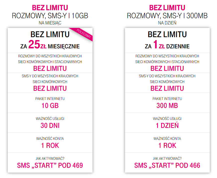 W lewej kolumnie mamy oferte miesięczną za 25 zł i ważność pakietu 30 dni, a konta rok. W prawej kolumnie zaś mamy pakiet bez limitu dla tych co korzystają spontanicznie i za 1 zł-kę na dzień dostajemy równiesz wszystko bez limitu i 300 MB.