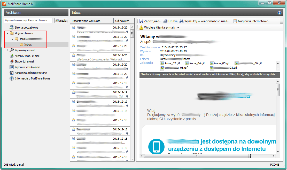 Są one w programie po lewej stronie w sekcji Moje archiwum, po rozwinięciu widać wszystkie adresy mailowe i wszystkie pobrane foldery. Po wybraniu folderu wyskoczy nam lista wiadomości  i możliwość ich przeglądania oraz usuwania. Wygląda to tak jak w programie pocztowym.
