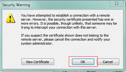 Po wpisaniu tych danych wyskoczy nam okienko z prośbą o weryfikację certyfikatu, nie musimy tego robić, wystarczy, że klikniemy OK.