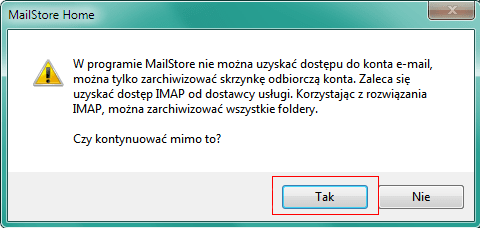 Możliwe, że wyskoczy nam okienko z informacją, że można zarchiwizować tylko katalog z pocztą przychodzącą. A głównie o nią nam chodzi, wtedy klikamy TAK.