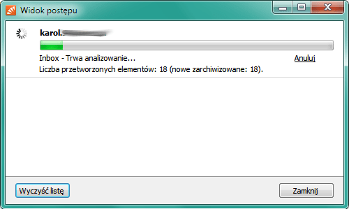 Klikamy dwukrotnie na adres e-mail z którego chcemy wykonać kopię zapasową wiadomości. Wyskoczy nam okienko z postępem pobierania wiadomości.