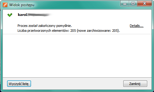 Gdy już pobierze, zobaczymy obok ptaszka, który jest informacją, że kopia została ukończona poprawnie. Czasem jest tak, że jest tych wiadomości bardzo dużo i nie chce nam pobrać wszystkiego naraz. Wtedy trzeba powtórzyć tą czynność. Na szczęście program nie pobiera dwa razy tych samych wiadomości, tylko sprawdzi czy takie już zostały zapisane, jeśli tak, to leci dalej.