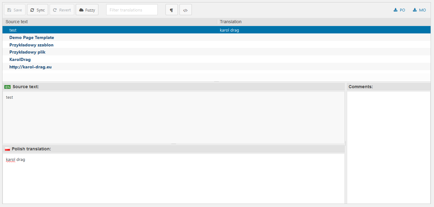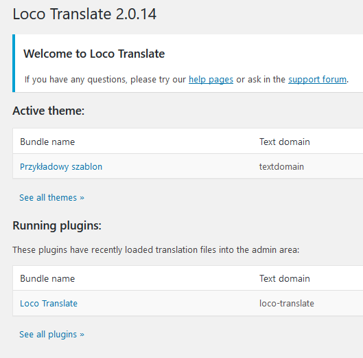 _e(’Przykładowy tekst 2′,’textdomain’);[/kod]Gdzie textdomain, to identyfikator dla naszych stringów. Często nazwą jest nazwa wtyczki lub szablonu.