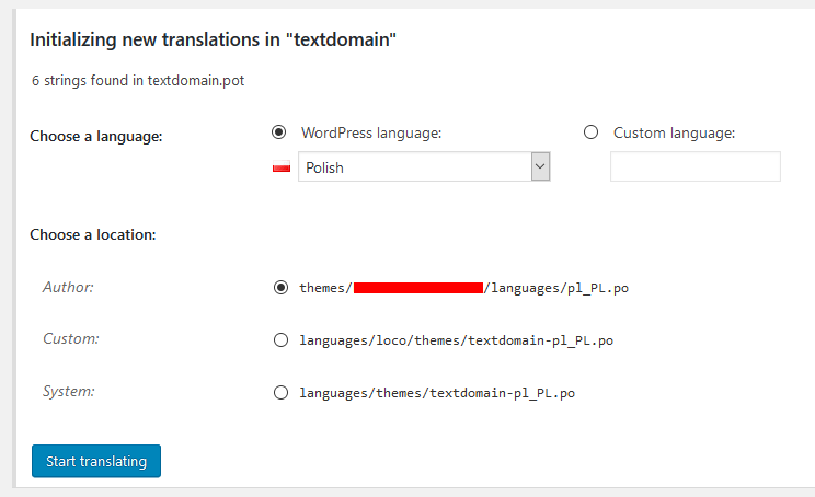 Tutaj wybieramy język oraz w jakim miejscu mają znajdować się pliki. Najlepiej zrobić to w plikach szablonu / wtyczki, którą tworzymy, wtedy będzie nam łatwiej edytować na przyszłość.