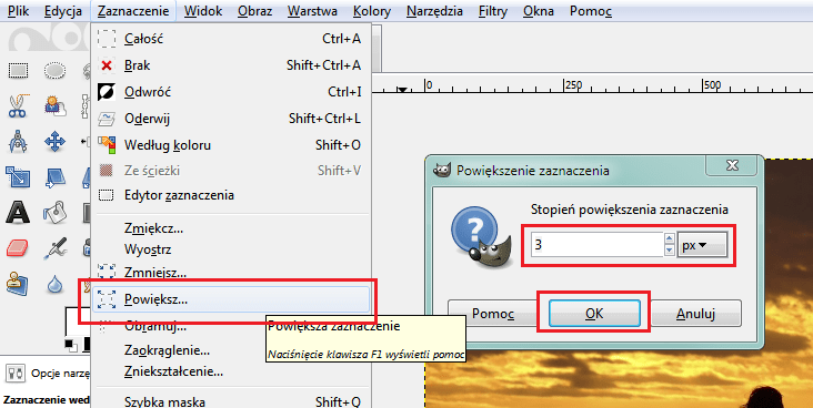 Następnym krokiem jest powiększenie zaznaczenia. Również wybieramy tą opcję w menu Zaznaczenie -> Powiększ… Jak widzisz wyskoczyło nam okienko, w nim wpisujemy o ile chcemy powiększyć, na początek polecam 3-5 px i klikamy OK.