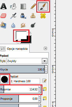 Pędzel wybieramy poprzez wybranie w lewym menu ikonki pędzla (skrót kl P).  Poniżej wybieramy rodzaj pędzla i jego rozmiar proponuję wybrać duży. A i nie zapomnijcie wybrać koloru powyżej z palety kolorów taki jaki będzie naszym tłem. Ja wybieram biały kolor.