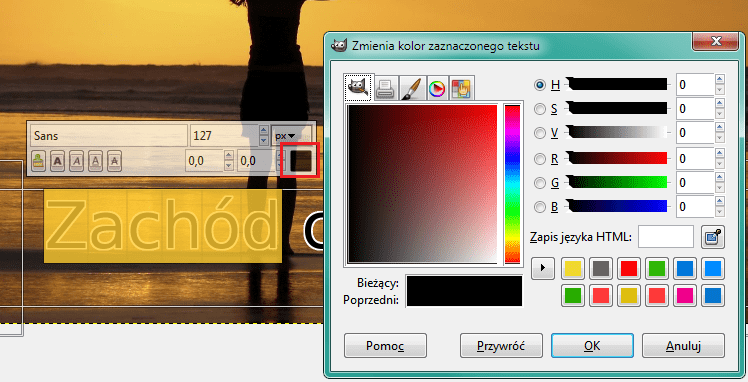 I z palety kolorów wybieramy kolor przesuwając myszką po palecie. Po wybraniu zatwierdzamy OK i kolorujemy resztę tekstu. Gdy już to zrobimy zostało nam zapisać zdjęcie.