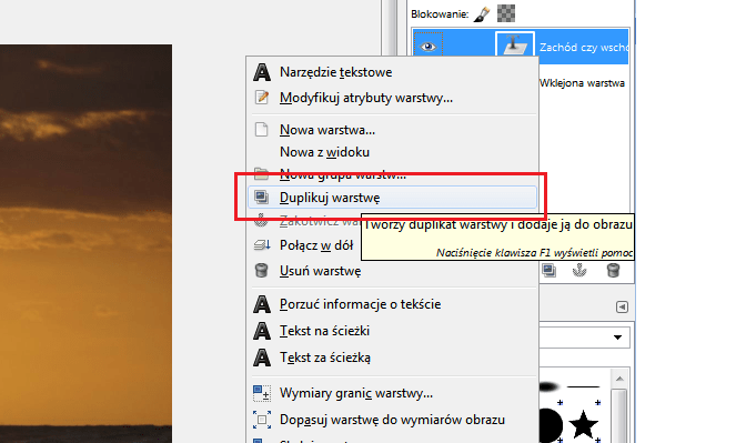 Gdy już mamy dodany i ułożony tekst, to nie przejmuj się, że go teraz nie widać, właśnie chce Ci pokazać, jak go wyróżnić na tle zdjęcia. Na początek musimy zrobić kopię tekstu. Po prawej masz listę wszystkich warstw i elementów. Klikamy na element oznaczający nasz tekst prawym klawiszem myszy i wybieramy opcję Duplikuj warstwę.