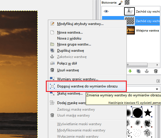 W takim przypadku, najłatwiej jest z prawej strony na tekście aktywnym kliknąć prawy klawisz myszy i wybrać opcję Dopasuj warstwę do wymiarów obrazu. I teraz na spokojnie możemy przejść do wyróżnienia tego tekstu.