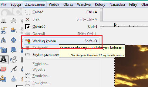 Pamiętaj, aby warstwa którą edytujemy była aktywna na liscie warstw. Teraz spokojnie przechodzimy do kolejnego kroku. W górnym menu wybieramy Zaznaczenie -> Według koloru (skrót kl. SHFIT + O) lub wybrać ikonkę z lewego menu.